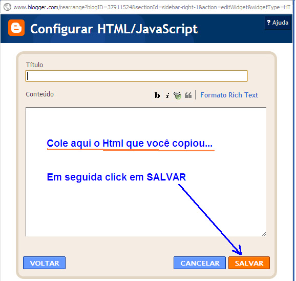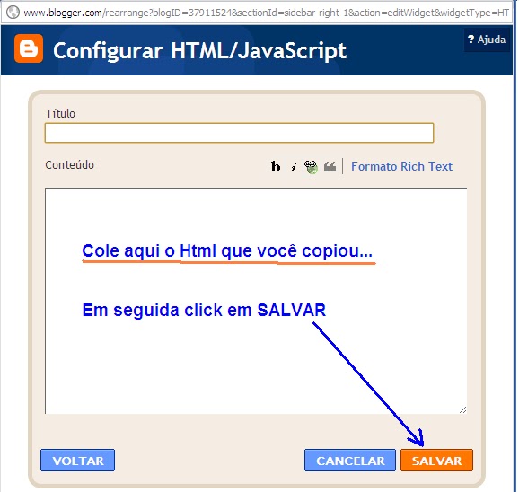 clique em html javascript e cole o código da tabela abaixo dentro da caixa que vai